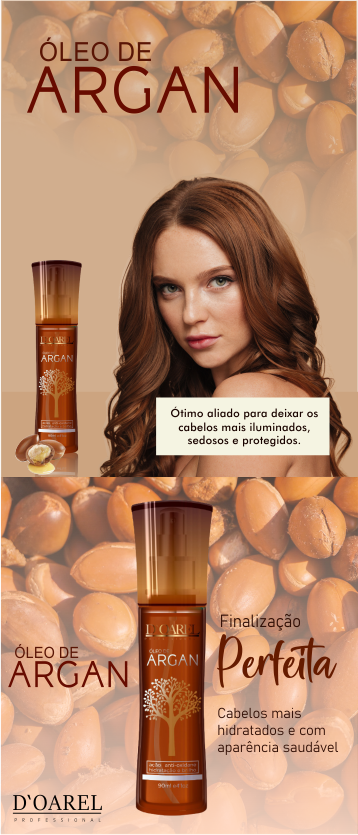 O Óleo de argan D’OAREL PROFESSIONAL conta com uma fórmula exclusivamente rica em agentes antioxidantes naturais do óleo de argan e Vitamina E que são absorvidos facilmente pelos cabelos, proporcionando imediatamente o condicionamento, brilho, preservando a cor e garantindo alta proteção para a escovação sem deixar resíduos.